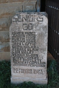 The ‘Seniors 38’ stone outside the one-room jail in Texola.