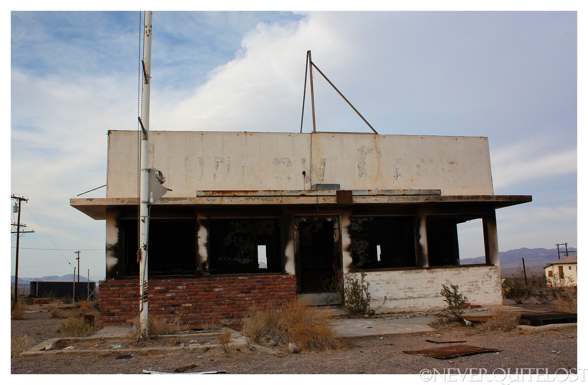 That all changed when I passed by a year later. Winter in the Mojave is cold at nights and apparently transients sheltering in the building had lost control of a fire. I hope that was the case. If the cafe had to burn, then better it was because it was giving shelter and comfort, if in reduced circumstances, as it had all its working life than because it was the victim of kids with too much time on their hands or a casual arsonist.
