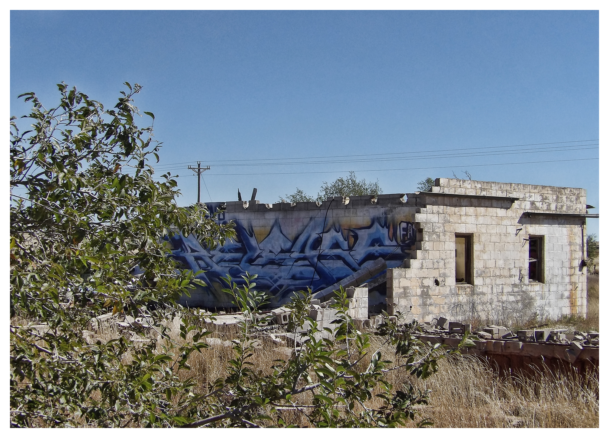 The Friends moved in 1975 and it’s likely that the cafe closed then. For some years it retained its streamlined lettering and, in 1990, when Troy Paiva (a man responsible for so many of the trips I have made in the last few years) used it for one of his ‘light painting’ photographs, the cafe was still open to the elements, the glass gone from the windows, but the counter still in place. If you look at the ‘1959 Cadillac on Route 66‘ channel on Youtube, you will find (among many of Anthony Reichardt’s other wonderful films) a video from August 1992, by which time the cafe was boarded up. When  I first saw the cafe fifteen years later in 2007, the freestanding lettering and the cafe sign were long gone, but the building was still in reasonable shape.